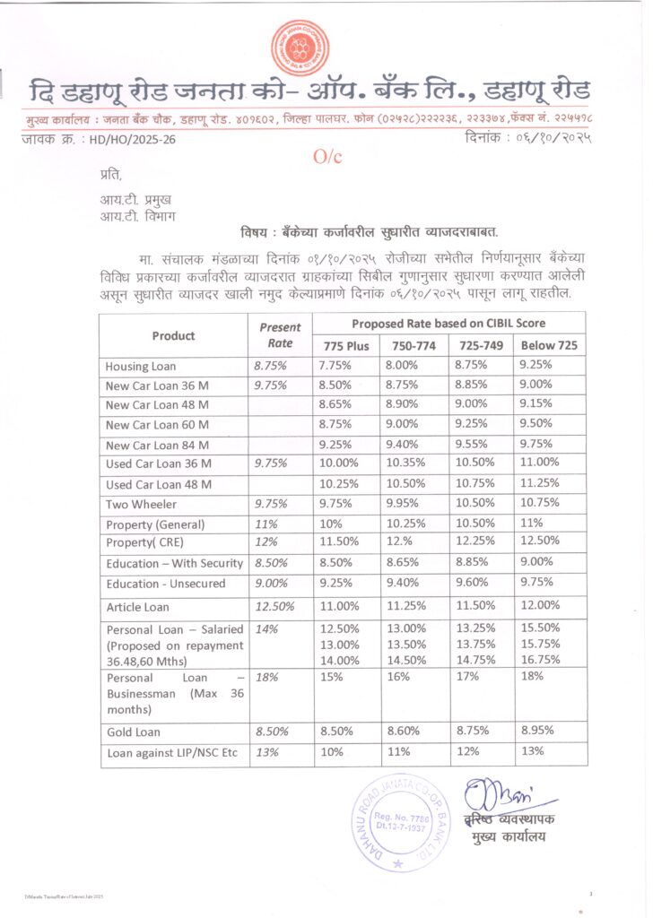 Announcing improved interest rates on various loan products offered at the bank according to the CIBIL score. बँकेच्या विविध प्रकारच्या कर्जावरील व्याजदरात, ग्राहकांच्या सीबील गुणांनूसार सुधारणा करण्यात आलेली असून सुधारित व्याजदर खालील प्रमाणे असतील.